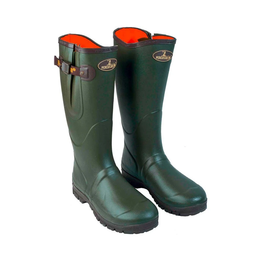 Les bottes de chasse Sologne de la marque Percussion sont réalisées à partir de caoutchouc naturel. Totalement imperméables, elles sont dotées d’une doublure en néoprène de 4 mm qui assure une excellente isolation thermique. Elles disposent d’un soufflet avec sangle d’ajustage au mollet pour vous permettre de les chausser facilement et rapidement. La semelle est antidérapante, elle est constituée de large et profonds crampons. Leur forme ergonomique et l’amorti particulièrement soigné leur confère un grand confort d’utilisation.