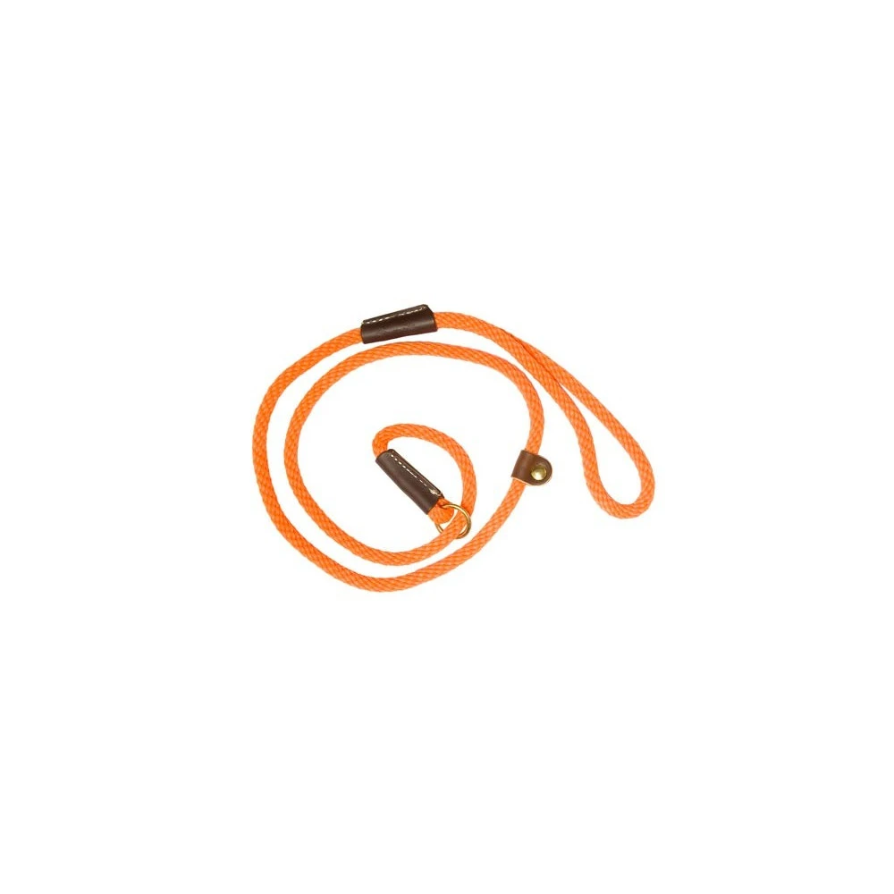 Laisse de dressage pour chien de chasse en polypropylène orange. Noeud coulant à l’extrémité. Inserts en cuir cousus. Marque Country. Diamètre 1 cm. Plusieurs longueurs disponibles.